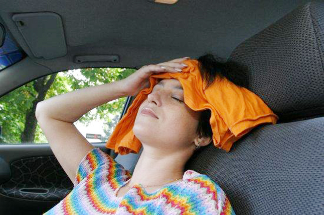 Если во время поездки в горячей машине у вас заболела голова, потемнело в глазах, зазвенело в ушах, участилось сердцебиение, повысилась потливость, нужно задуматься о необходимых мерах. Что же делать, если вы отмечаете у себя все признаки? Во-первых, поставьте машину в тень, выйдите из машины. Если есть возможность, умойтесь холодной водой или оботритесь влажными салфетками. Можно также положить холодных компресс. Отдышитесь и как только почувствуете, что стало легче, и можно снова за руль.